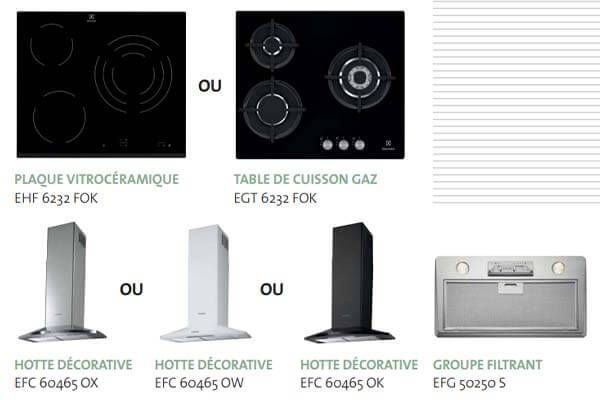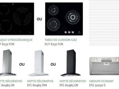 - Electroménager (plaque vitrocéramique, table de cuisson au gaz, hotte aspirante...)