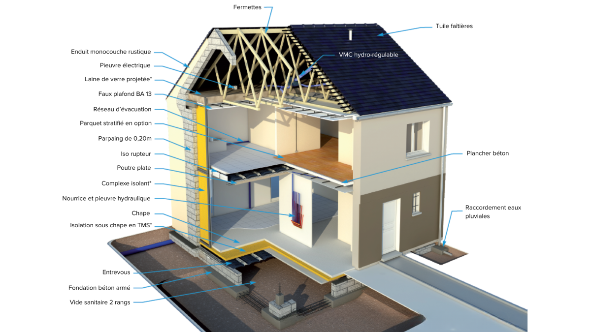 Du vide sanitaire à la toiture, un grand nombre de matériaux entrent en compte pour garantir la solidité, la fiabilité, l’esthétique et l’efficacité thermique d’une maison : fondations, plancher béton, complexe isolant, réseau d’évacuation, laine de verre, enduit…